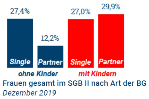 Im allgemeinen Durchschnitt lag der Anteil der Frauen, die als Alleinerziehende oder mit einem Partner in einer Bedarfsgemeinschaft mit mindestens einem Kind lebten, bei 57 Prozent und war damit sehr viel niedriger.
