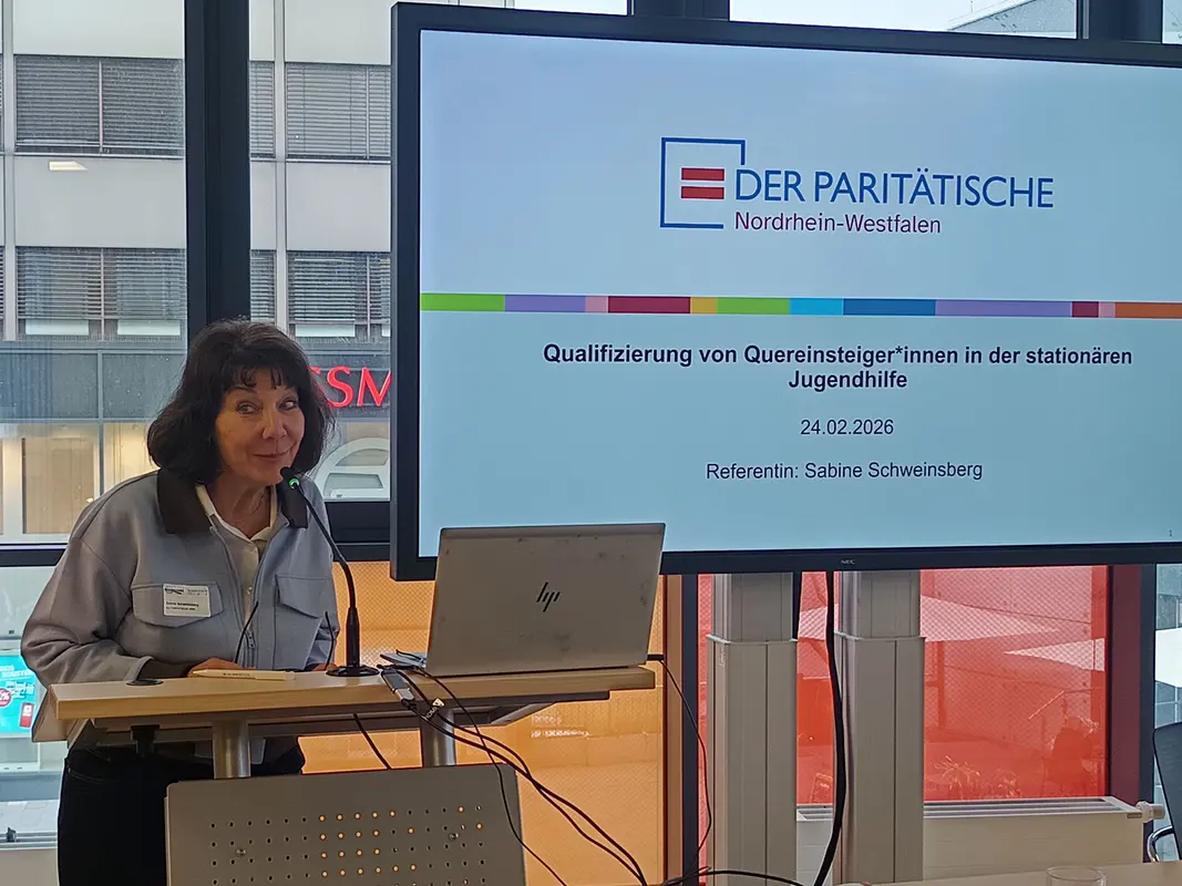Einen großen Teil des Fachtags nahmen der Bereich Quereinsteiger*innen bzw. die Qualifizierung fachfremder Kolleg*innen ein. Während einige darin eine Chance sehen und „die Externen“ als Bereicherung fürs Team empfinden, fürchten andere eine Verwässerung der Fachlichkeit. Sabine Schweinsberg, Fachreferentin Hilfen zur Erziehung beim Paritätischen NRW, stellte das Qualifizierungsprogramm ihres Verbandes vor. Ein großer Vorteil sei, dass die Personen schon während der Qualifizierung eingesetzt werden dürften.