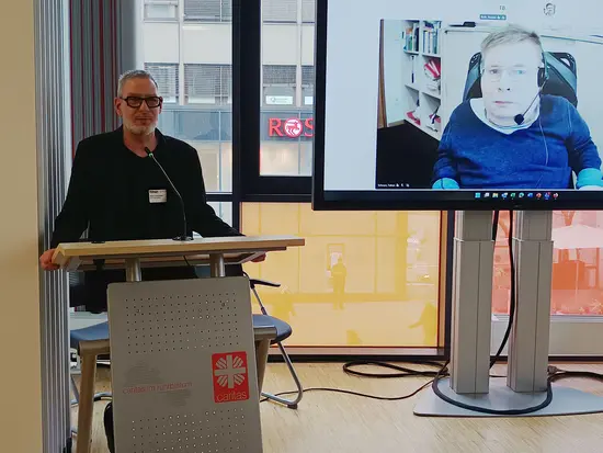Stefan Corda-Zitzen, Geschäftsführer Psychiatrische Hilfsgemeinschaft Viersen, setzt ebenfalls auf Quereinsteiger*innen in der Eingliederungshilfe – vom Koch bis zum Fliesenlegermeister. Er berichtete von den praktischen Erfahrungen im Arbeitsalltag. „Jeder Mensch trägt auf seine Art zu kreativen Lösungen bei, die den Menschen weiterhelfen können“, berichtete er. „Die neuen Sichtweisen sind auf jeden Fall ein Gewinn.“
