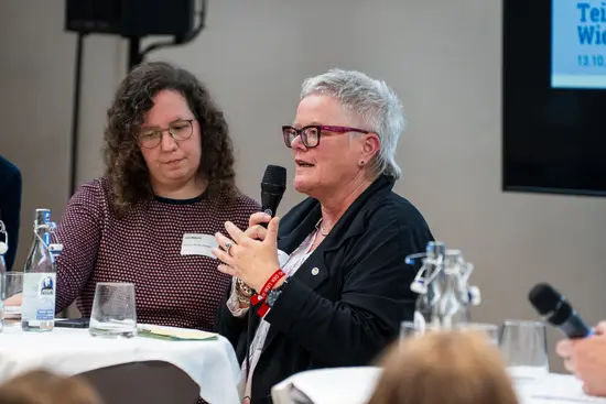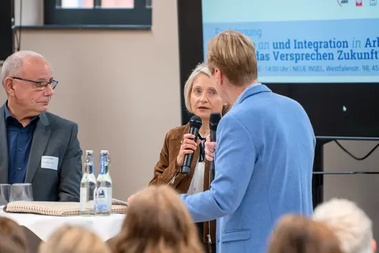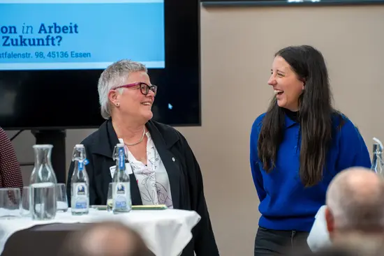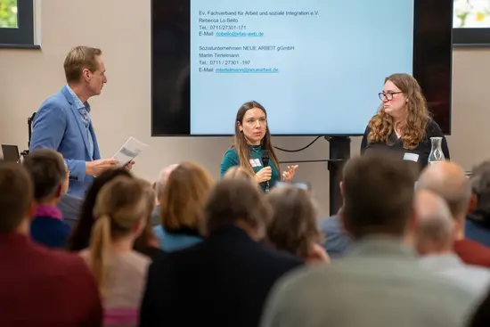 Projektleiterin Rebecca Lo Bello und Interviewerin Sonja Gaidusch gaben Einblicke in die Studie des Evangelischen Fachverbandes Arbeit und Soziale Integration „Arbeit lohnt sich immer?!“. Die quantitative Untersuchung zeigt, dass Ängste, den Anforderungen des Arbeitsmarktes nicht gewachsen zu sein, eines der größten Hemmnisse für langzeitarbeitslose Menschen beim Wiedereinstieg in Beschäftigung darstellen. Zu den insgesamt acht Lösungsvorschlägen gehört unter anderem, niedrigschwellige Begegnungsräume zu schaffen, etwa durch Einladungen von Arbeitgeberinnen und Arbeitgebern in Maßnahmen oder durch Job-Speed-Datings. Ebenso wichtig ist es, engere Vermittlungsnetzwerke zwischen Trägern und Arbeitgebenden aufzubauen.